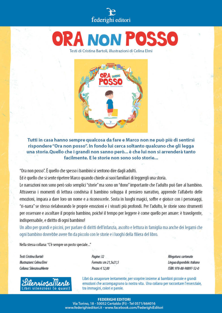 Tutti in casa hanno sempre qualcosa da fare e Marco non ne può più di sentirsi rispondere “Ora non posso”. In fondo lui cerca soltanto qualcuno che gli legga una storia.Quello che i grandi non sanno però… è che lui non si arrenderà tanto facilmente. E le storie non sono solo storie…