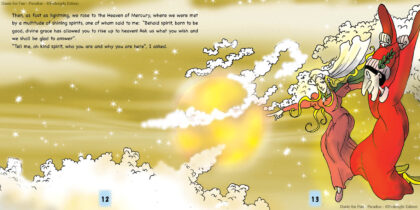 Di cielo in cielo la luce s’intensifica sempre più fino ad arrivare all’Empireo dove Beatrice scompare per lasciare il posto a San Bernardo, che accompagna Dante verso l’immenso ed eterno regno di Dio.